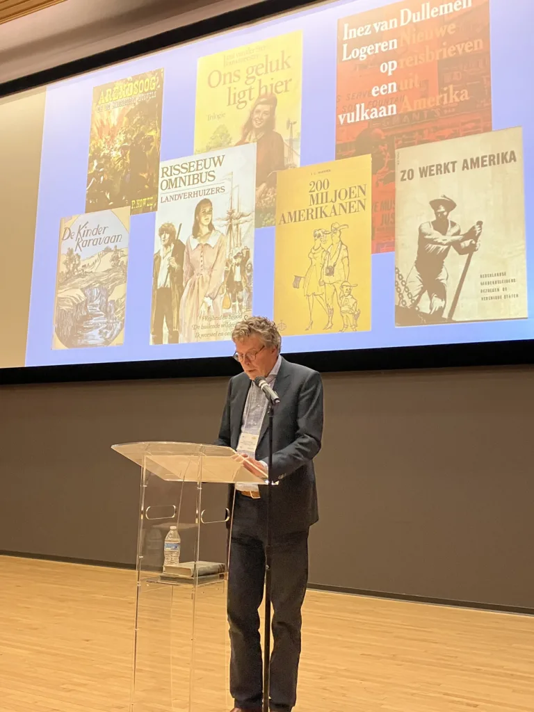 De tweede keynote, waarmee het congres afsloot, werd door Ton van Kalmthout gegeven. Van Kalmthout, die werkzaam is aan het Huygens Instituut en de Rijksuniversiteit Leiden, hield een fascinerende lezing over “Dutch-American Emigration Literature after World War II”, waarna een boeiend gesprek in de vragenronde met deelnemers plaatsvond. De keuze voor dit onderwerp was bijzonder treffend aangezien veel deelnemers zich herkenden in de ervaringen die hij beschreef. Velen in het publiek waren immers zelf immigranten of nazaten van immigranten, of mensen die de impact van migratie in het koloniale verleden van Nederland ervaren.