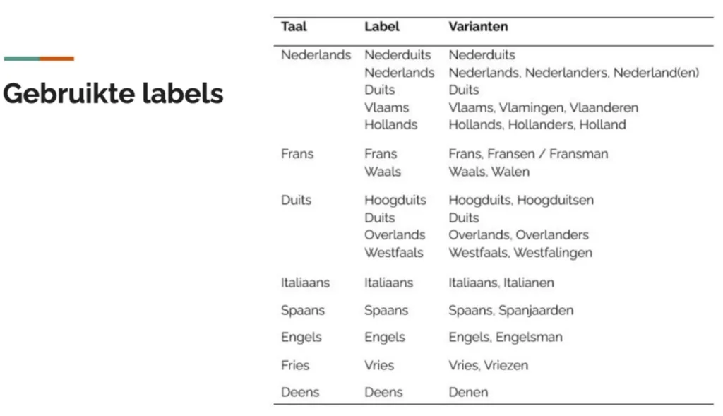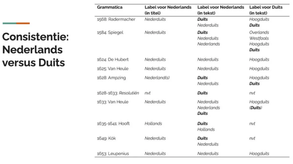 Voor Nederlands werden nog meerdere labels gebruikt: Nederduits, Duits, Nederlands Vlaams en Hollands. Bij de labeling van ‘Vries’ in de tweede helft zestiende eeuw maak ik hierbij de opmerking dat dit in deze tijd ook als een verwijzing naar het Nederduits (in Vriesland) moet worden beschouwd (zie tekst 3 van de Twe-spraack van Spiegel).