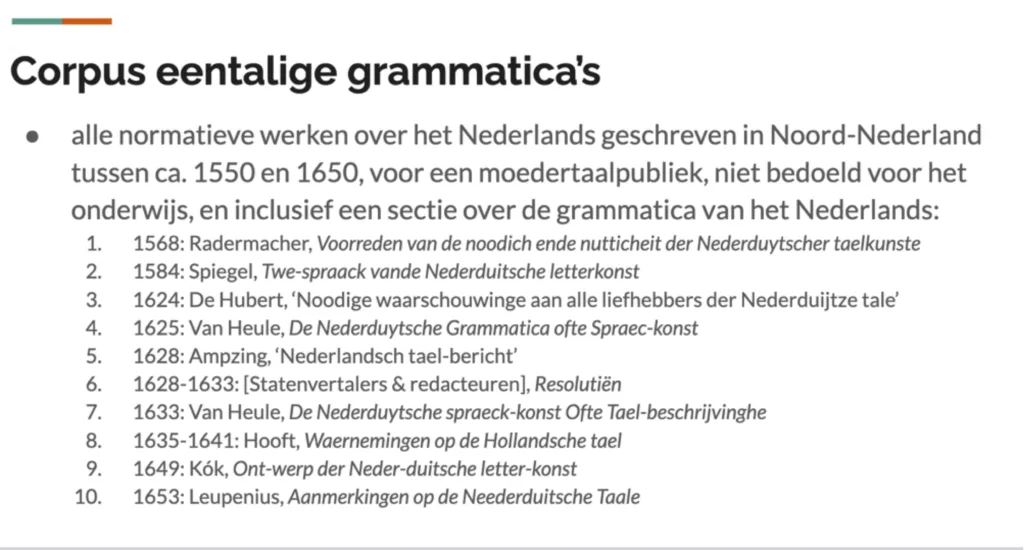 In die tijd van renaissance kwam de taal als studieobject op en de wens de verbasterde taal [naar voorbeeld van het Latijn] te herscheppen tot een strak beregelde eenheidstaal. Vogl en De Vos noemen dit construeren Language Making. De actoren met de grootste invloed zijn grammatici, leraren en uitgevers. Bij hun onderzoek hebben ze de focus op de periode van de renaissance gericht. Centraal in dit constructieproces is het benoemen waarmee het concept wordt geschapen. Met dit doel hebben zij onder andere tien eentalige grammatica’s bekeken (zie dia Corpus eentalige grammatica’s) en meertalige gespreksboeken.