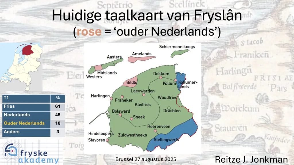 . Het is de beschrijving van de komst van het dialectisch gekleurde Nederlands aan het eind van de middeleeuwen tot aan de huidige kaart met niet-Friestalige enclaves (zie Huidige taalkaart van Fryslân).
