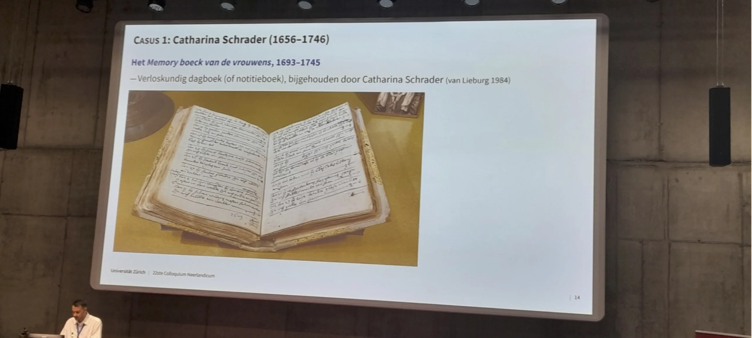 Andreas Krogull op 27 augustus in Brussel over het Memoryboeck van de vrouwens van Catharina Schrader (foto auteur)