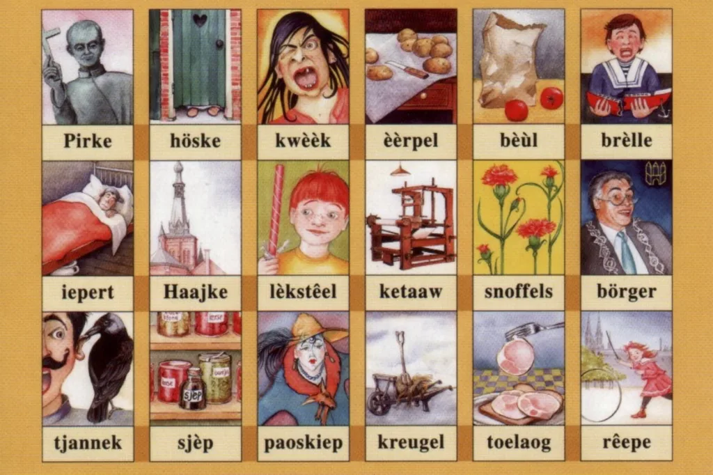 (Zie voorbeeld hieronder van leesplankje van een Nederlands-Limburgsdialect).