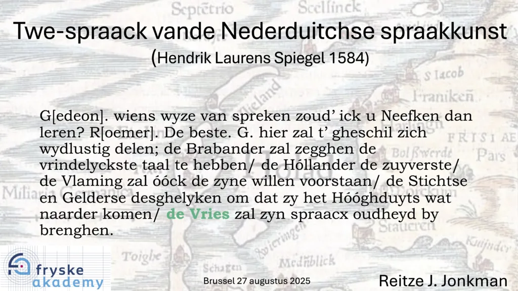 De overname door de migratietaal in de zestiende eeuw leidde niet alleen tot de ontfriesing van de meeste steden maar ook tot het verdwijnen van het Fries als schrijftaal en als officiële taal. Het terugdringen van het eigenlijke Fries tot een op het platteland gesproken variëteit had in de vroegmoderne periode tot gevolg dat dit werd ingedeeld bij de gevarieerde daktaal Nederduits. Hendrik Laurens Spiegel plaatste deze als ‘Vriesch’ gelabelde taal van de Vriesen naast die van de Brabanders, Hollanders en Vlamingen (zie tekst 3).