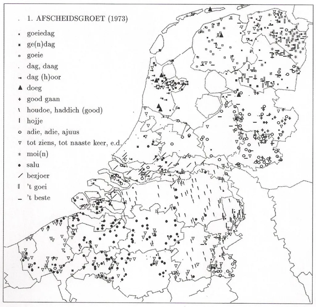 Allebei de verklaringen kunnen natuurlijk waar zijn. Een paar jaar geleden schreef ik over het verschijnsel groetronding dat ervoor zorgt dat mensen (inmiddels?) ook dag! zeggen met geronde lippen. Uit de kaart van Jan Stroop hierboven valt op te maken dat heel veel dialectgroetwoorden ook ronde klinkers hebben: moi, hojje, ajuus, houdoe, enzovoort. Tot mijn schande kende ik Jansens artikeltje niet toen ik het verschijnsel beschreef. En dat je een informele sfeer kan creëren, voor een groet onder bekenden, door een wat afwijkende vorm te gebruiken, lijkt me ook goed te zien.