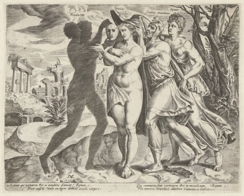 De valse waan ruïneert de wereld: De waarheid verborgen door leugen/ Dirck Volckertsz. Coornhert, 1575 – 1581. Collectie Rijksmuseum