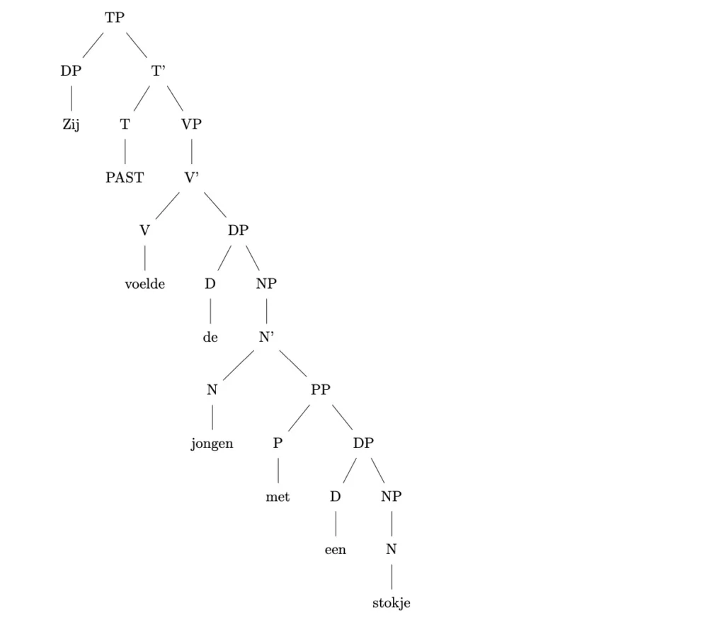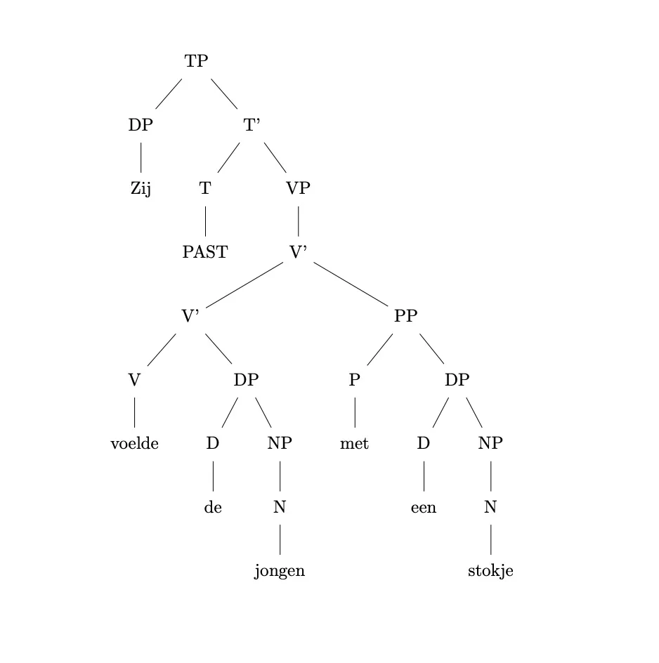LaTeX is een software waarmee je bomen kunt tekenen, ook als je een chatbot bent. X-bar-theorie is (alweer, zeker in inleidende colleges) de populairste theorie voor het tekenen van bomen. Dit is het antwoord dat ik krijg. Excuses namens ChatGPT dat hij zich hier ineens te buiten gaat in technisch jargon, in ieder geval ontdekt het systeem moeiteloos de dubbelzinnigheid: zij gebruikte een stokje om te voelen, of de gevoelde jongen had een stokje.