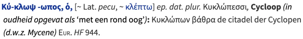 Het tweede gedeelte, ὤψ (ōps), betekent ‘oog’ en is ook verwant aan ons woord oog. De cycloop is dus letterlijk de rondogige.