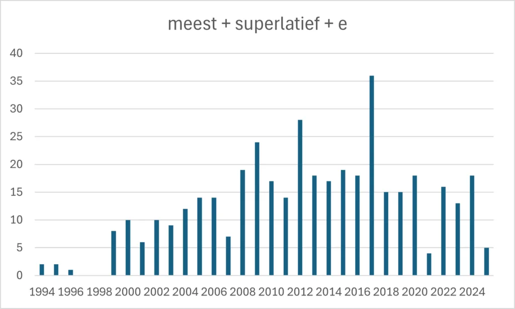 Op de enorme hoeveelheid documenten in het CHN (meer dan 10 miljoen) en het nog imposantere aantal woorden (meer dan 3 miljard) komt de constructie meest + superlatief + -e procentueel gezien slechts zeer sporadisch voor: 0,000013% om precies te zijn.