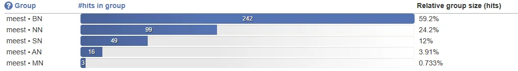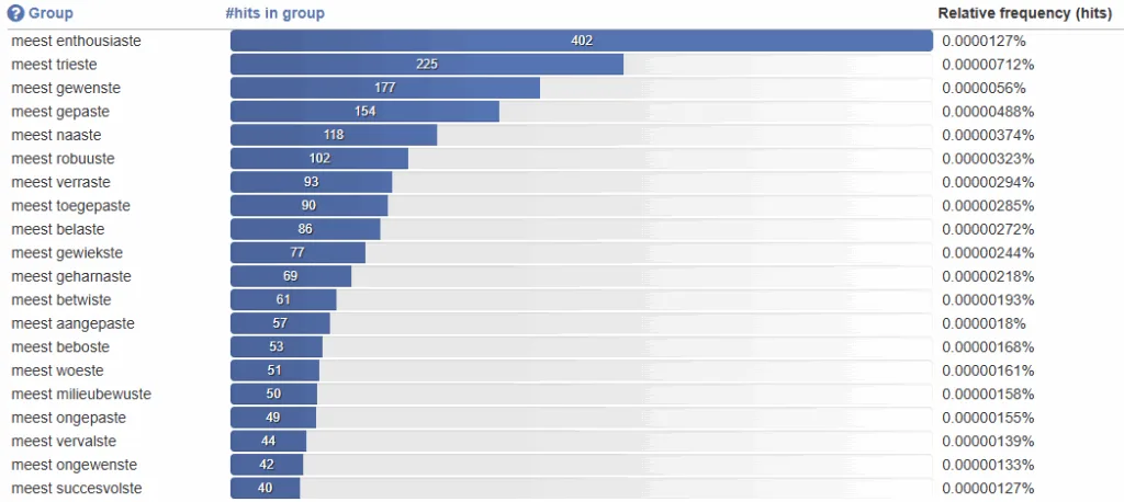 De zoekopdracht [word = “meest”] [word = “.*ste”] levert in totaal 3350 treffers op, verspreid over 349 groepen.