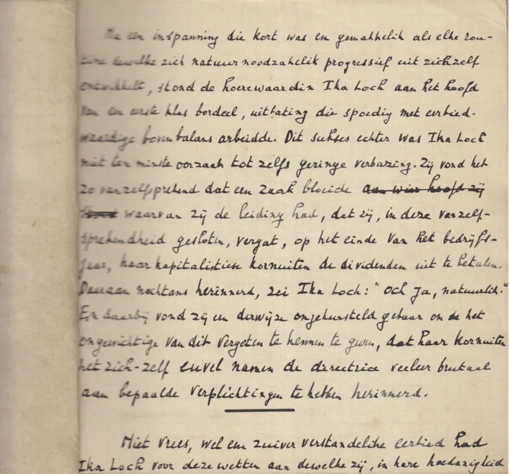 Eerste bladzijde van het in 2016 ontdekte handschrift van ‘Het bordeel van Ika Loch’. Op deze eerste pagina zijn al twee verschillen met de druk in Cahier nr. 5 te vinden: eerbiedwaardige > eerbiedwaarde; zich-zelf > zichzelf.