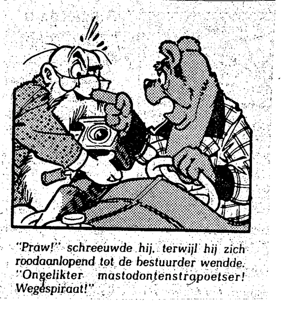 Datzelfde, maar over het algemeen beduidend geestiger, deed Maarten Toonder bij monde van zijn Duitse professor Prilwytzkofski. In het volgende stripje komen beide bovenstaande manieren in uiterst kort bestek voor: ‘wegespiraat’, ‘ongelikter mastodontenstrapoetser’.