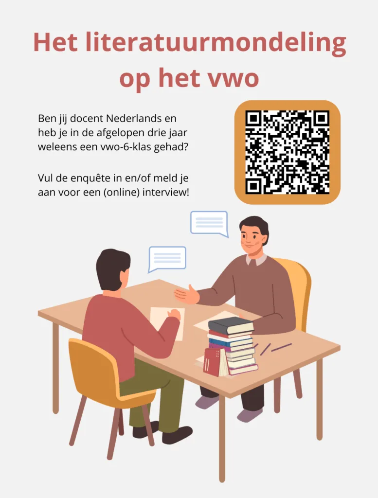 Voor dit onderzoek zoeken zij docenten Nederlands die in de afgelopen drie jaar weleens een vwo-6-klas hebben gehad. Is dit op jou van toepassing? Door deze enquête in te vullen lever je een waardevolle bijdrage aan het onderzoek. Alleen met input van zoveel mogelijk leraren kunnen zij een scherper beeld krijgen van de manier waarop het literatuurmondeling bij Nederlands op het vwo ingevuld wordt! Het invullen van de vragenlijst duurt ongeveer 15 tot 20 minuten.