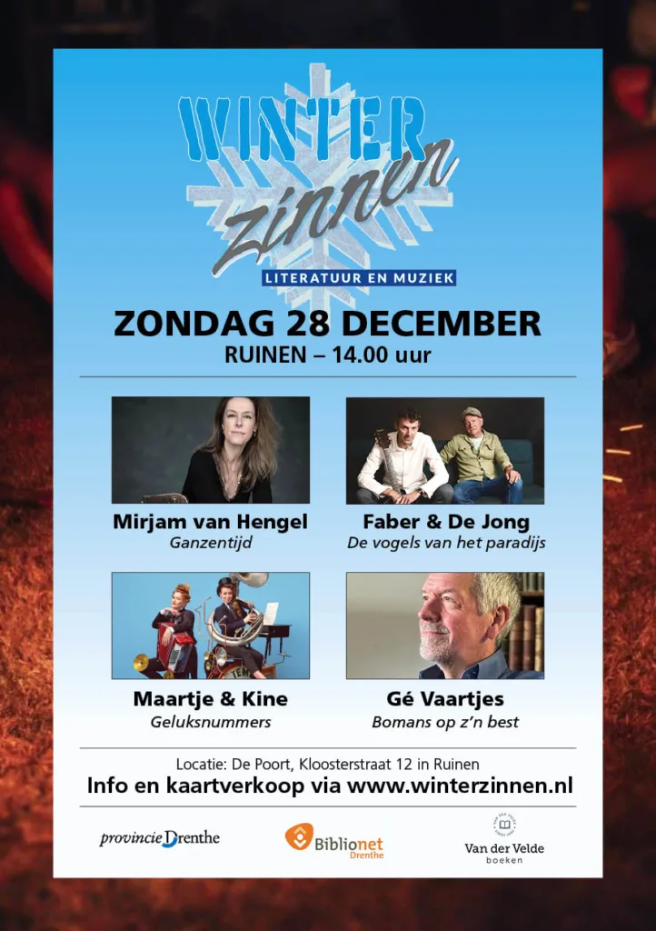 Stichting Literaire Activiteiten in Drenthe brengt schrijvers, muzikanten en publiek bij elkaar op de zesde editie van Winterzinnen. Zondag 28 december wordt in De Poort in Ruinen een middag gepresenteerd met nieuwe boeken, theater en muziek.