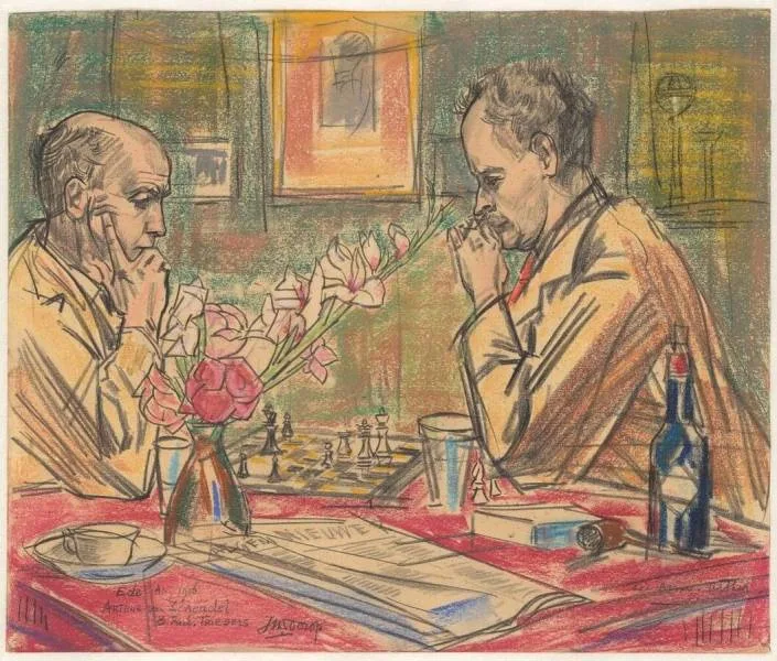 Over die schets ben ik nu best tevreden. Het was nog grotendeels handwerk, zonder veel online hulpmiddelen, geen Google, geen Wikipedia, geen Delpher – etc. Wie nu Google, Wikipedia, Delpher of de zogenaamde AI gebruikt om meer te weten te komen over de broers Triebels komt niet veel verder dan ik midden jaren 1990. Veel van wat je vindt over Maurits Triebels heeft mijn artikel als bron, over Rudolf Triebels blijft de informatie minimaal. Ik hoopte een beetje dat de biografie van Rob Groenewegen mij meer nieuws over hem zou leren, maar dat is helaas niet zo. Triebels wordt als ‘jeugdvriend’ vermeld, hij was getuige bij het tweede huwelijk van Van Schendel, hij was als twintiger met hem en andere schrijvers en journalisten stamgast in een Amsterdams etablissement en bezocht in de jaren 1920 diverse keren Van Schendel in diens huis in Italië. Nieuw voor mij waren de portretten van Triebels: een foto en een tekening van Toorop waarop hij met Van Schendel schaakt.