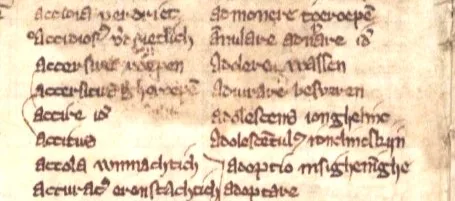 De transliteratie van ‘t glossarium zelf, omvattende 7964 lemmata, volgt van bladzijde 157 tot en met 226. Dit overschrijven is monnikenwerk geweest dat niet onderdoet voor dat van de veertiende-eeuwse kopiist. Bij een aantal items staat een sterretje dat verwijst naar filologisch commentaar, meestal is dat een verklaring of een hertaling van ’t Middelnederlandse vertaalwoord. Dit deel gaat van bladzijde 227 tot en met 278. Het boek wordt afgesloten met een alfabetische index op de Middelnederlandse woorden. Ook geen gering kopieerwerk. En dan wordt ons nog een digitale retrogradelijst in ‘t vooruitzicht gesteld (blz. 147).