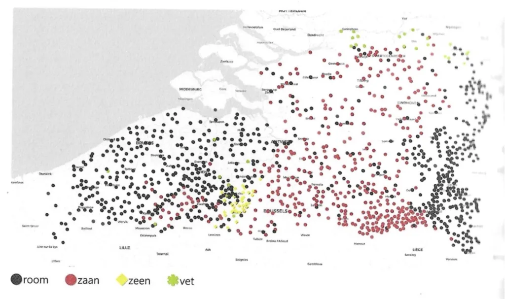 Vaak weerlegt een kaartje de conclusie uit ’t artikel. Bij ardea (‘reiger’) bijvoorbeeld. Trevirense geeft de benaming heigher. Die variant “is in elk geval Vlaams, Brabants en Limburgs”, zegt de tekst, maar op ’t kaartje komt heigher alleen voor in Frans- en Zuid-West-Vlaanderen. En dan volgt de conclusie dat de variant in Trevirense (heigher dus) in elk geval Vlaams, Brabants en Limburgs is. En dat bewijzen de andere glossaria. Dat lijkt op een cirkelredenering.