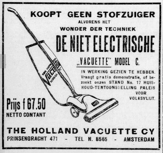 Nederlandse consumenten kunnen in 1922 kennis maken met dit ‘wonder der techniek’. Tijdens de Huishoudtentoonstelling in het Amsterdamse Paleis voor Volksvlijt demonstreert The Holland Vacuette Company de werking van deze stofzuiger, die voor fl. 67,50 te koop aangeboden wordt (De Telegraaf, 24 september 1922). De ‘nieuwe motorlooze Amerikaansche stofzuiger’ wordt ook gedemonstreerd tijdens een tentoonstelling van de Nederlandsche Vereeniging van Huisvrouwen in Musis in Arnhem (Arnhemsche Courant, 15 november 1922) en tijdens een bijeenkomst van de ‘Vereeniging van Huisvrouwen’ in Amicitia in Leeuwarden (Leeuwarder Courant, 24 februari 1923). De firma E. Wigboldus uit het noorden van het land biedt zelfs elke donderdagmiddag gratis een demonstratie aan huis aan (Provinciale Drentsche en Asser Courant, 30 april 1923).