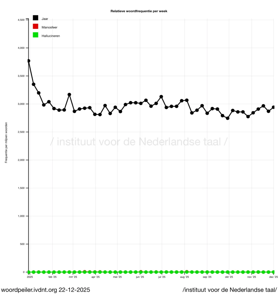 In 2025 kwam het lemma jaar maar liefst 605.916 keer voor op een totaal van 164.260.367 woorden. Dat staat in schril contrast met de 169 voorkomens van manosfeer. En ook het lemma hallucineren kan daar met het schamele aantal van slechts 127 treffers alleen maar van dromen!