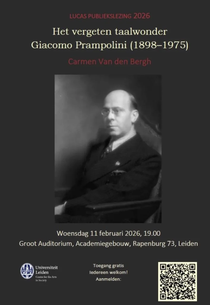 Op woensdagavond 11 februari vindt in het Leidse Academiegebouw de LUCAS publiekslezing van 2026 plaats, waarbij een onderzoeker uit het Leiden University Centre for the Arts in Society (LUCAS) voor een breder publiek over diens vakgebied spreekt. Dit jaar is de eer aan universitair docent Italiaanse letterkunde Carmen van den Bergh, met een lezing getiteld ‘Het vergeten taalwonder Giacomo Prampolini (1898–1975)’.