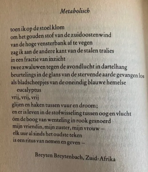 YT: Naast de expliciete maatschappijkritische poëzie zijn er de gedichten waarin de verbeelding van Afrika vorm krijgt, de vele liefdesgedichten, de lyriek waarin verval, verrotting en de dood bepalende motieven zijn, het nomadische Middenwereld-discours, de Zenboeddhistische gedichten. Is er een facet in Breytenbachs poëzie dat je met bijzondere belangstelling of affiniteit hebt gelezen?