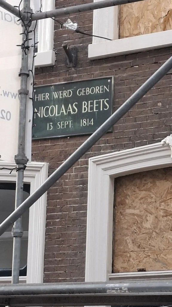 Na afloop lopen we nog even naar de plek van het geboortehuis van Beets in de Koningstraat. Het ouderlijk huis was al gesloopt. Het huidige pand staat in de steigers. Aan de gevel, tussen de steigerstangen door, is nog net de ijzeren plaquette te lezen. Witte letters tegen een donkergroene achtergrond. Een sterfjaar ontbreekt. Alsof hij nog leeft. En in zekere zin is dat ook zo.