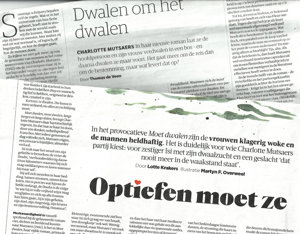 Lotte Krakers (de Volkskrant, 17 januari) heeft de interviews met Mutsaers ook gelezen. In haar bespreking van Moet dwalen, citeert zij Mutsaers, die geen feminist is en vindt dat een stevig fictieboek ‘een man of zoon moet hebben’. Recensente Krakers voelt zich aangesproken. ‘Daar [uitspraken Mutsaers, NK] kun je een boel van vinden en dat doe ik ook, het zijn dingen die misschien niet helemaal thuishoren in een boekrecensie. Maar: Mutsaers provoceert, en ik kán er gevoelsmatig niet op reageren. Als ik dat wel doe, ben ik van het starre type Fleur Vischbeen. Een drammer. Ik sta als recensent (en feminist) buitenspel.’