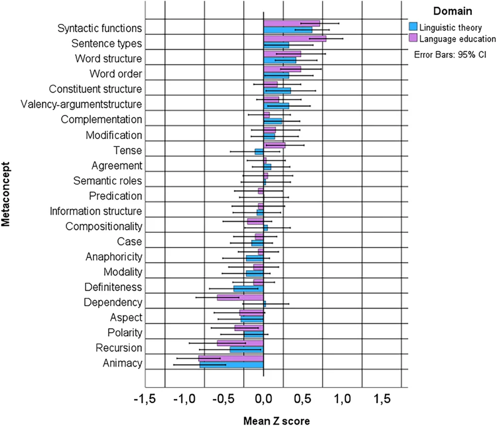 De begrippen staan geordend van het belangrijkst naar het minst belangrijk; daarbij wordt verschil gemaakt tussen ‘belangrijk voor de wetenschap’ (blauw) en ‘belangrijk voor het onderwijs’ (paars), hoewel die twee in veel gevallen met elkaar overeenstemmen. Het belangrijkst zijn ‘syntactische functies’, zoals onderwerp en lijdend voorwerp, en zinstypen (vragende zin, bevel, enzovoort), het minst belangrijk recursie (het feit dat je bijvoorbeeld een zin als ‘Jan leest’ kunt inbedden in een andere zin als ‘Koos ziet dat Jan leest’) en animacy (bezieldheid; het feit dat ‘We ontnemen Koos zijn fiets’ met een ‘bezield’ meewerkend voorwerk Koos wel goed is maar ‘We ontnemen de auto zijn deur’ niet).