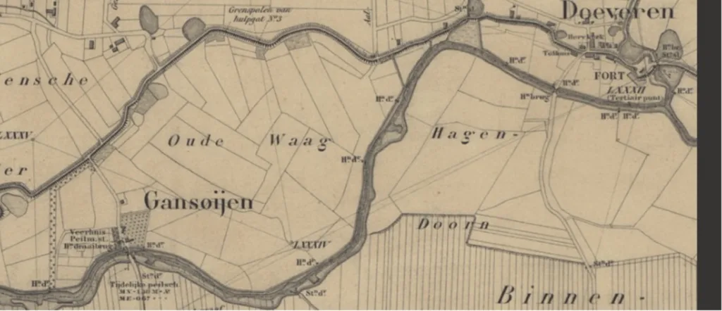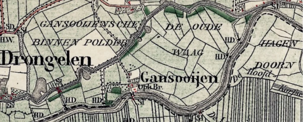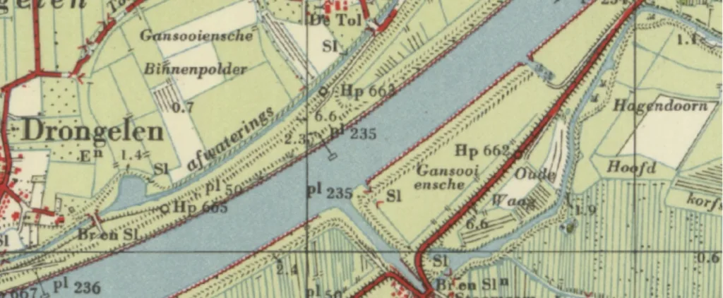 De Maas loopt van de zuidzijde van Doeveren naar Gansoijen. Drongelen ligt linksboven. De Oude Waag is het gebied waar de rivier zijn water kwijt kan in geval van hoog water. De dijk ligt op grote afstand. We zien er dijkdoorbraakwielen. Kennelijk was er soms toch nog te weinig plek voor het water. Bij Drongelen-oost bevindt zich een perceel met de veldnaam Zandweide. Die naam ontleent het perceel aan de omstandigheid dat ooit bij een dijkdoorbraak zo veel zand uit de doorbraakkolk meegenomen werd dat tot op de dag van vandaag daar een zanderige bovenlaag ligt.