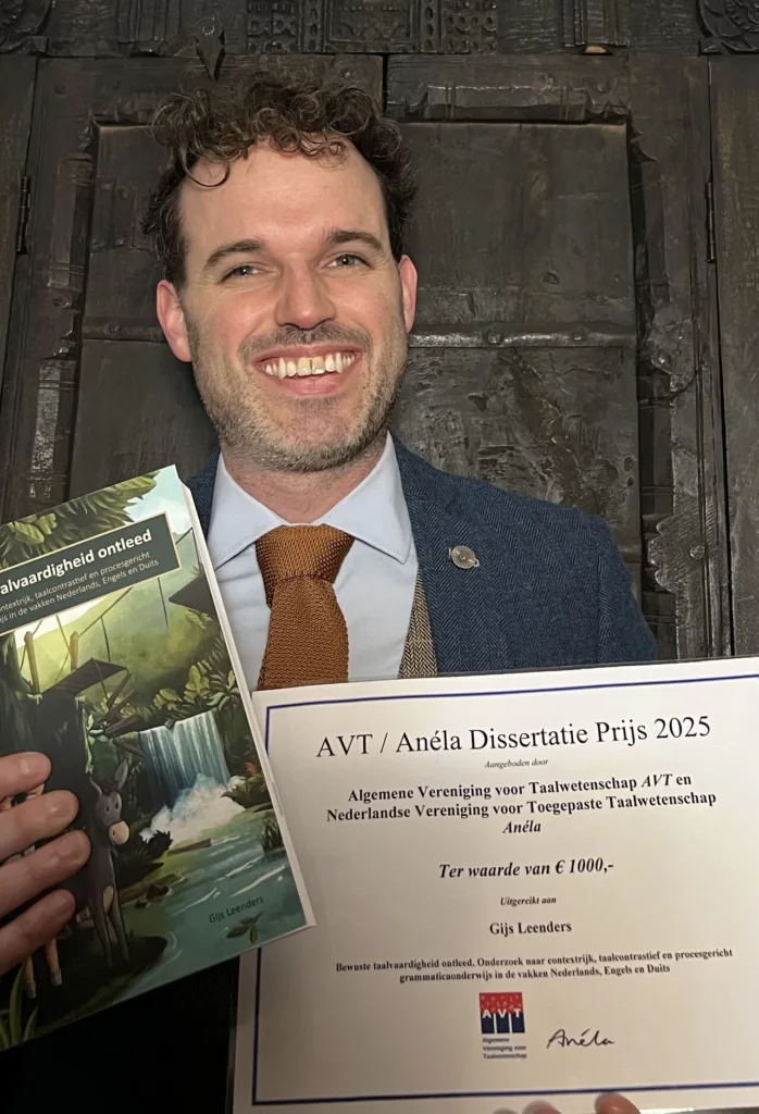 Tijdens het Taalgala hedenmiddag heeft Gijs Leenders de dissertatieprijs van de taalkundige verenigingen AVT en Anéla gewonnen. Leenders ontving de prijs voor zijn proefschrift Bewuste taalvaardigheid ontleed. Onderzoek naar contextrijk, taalcontrastief en procesgericht grammaticaonderwijs in de vakken Nederlands, Engels en Duits uit handen van een jury bestaande uit de taalkundigen Jacomine Nortier, Marije Michel, Joyce Lamerichs, Gert-Jan Schoenmakers en Constantijn Kaland.