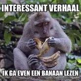 Ik moest namelijk even nadenken over wat de auteur bedoelt met de term ‘bananenlezers’. Wie leest er nou in vredesnaam een banaan? En wat zou dan de figuurlijke betekenis ervan kunnen zijn? Op een bepaald moment schoot me opeens een meme te binnen, die in een grijs Facebook-verleden nog wel eens gebruikt werd als reactie van mensen die niet geïnteresseerd waren in het verhaal dat gedeeld werd. De meme vind je hiernaast.