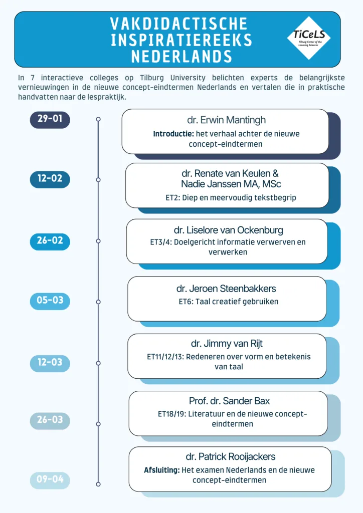 In de Vakdidactische Inspiratiereeks Nederlands vertalen experts de belangrijkste vernieuwingen in de eindtermen naar de lespraktijk. De reeks vindt plaats op de campus van Tilburg University, in de periode januari-april 2026.