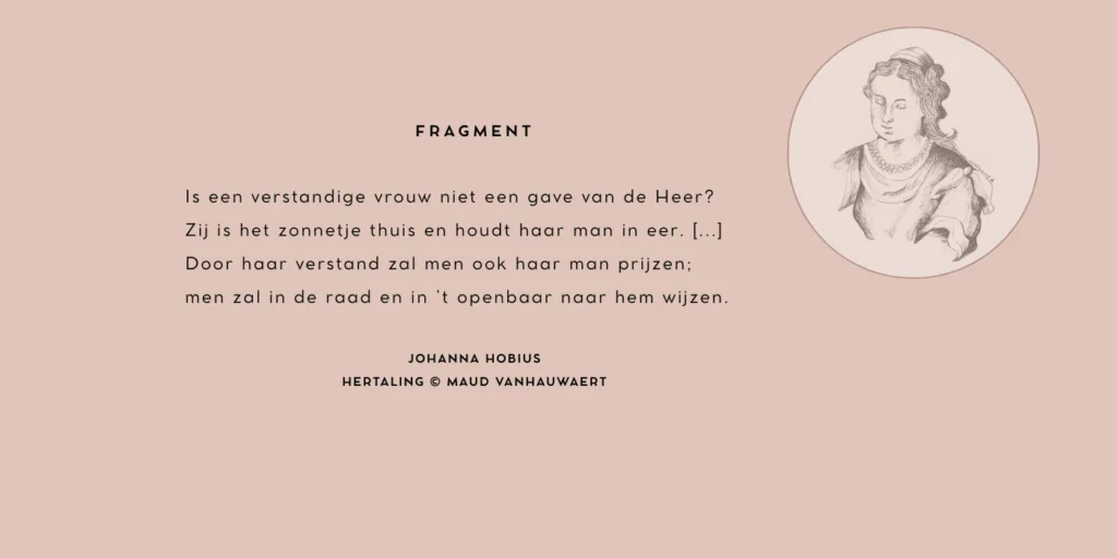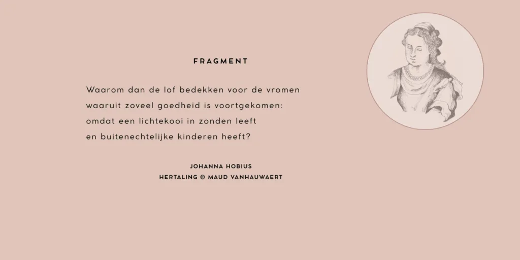 Je kunt de tien pagina’s hertalingen van Hobius’ werk in z’n geheel lezen op de site van Fixdit. Niet de hele lof zal in de podcast worden voorgedragen. Welke passages wel, hoor je volgende week vrijdag, in de podcast over Johanna Hobius. Dan hoor je meer!