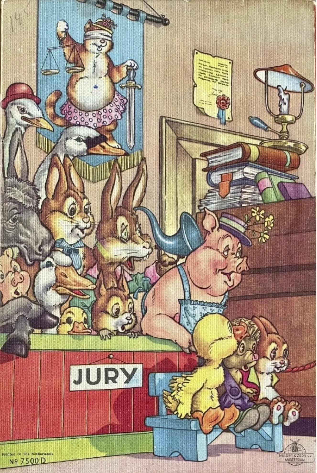 Merkwaardig is dan ook dat er een discrepantie is tussen de inhoud van dit boekje en de afbeeldingen op voor- en achterkaft. In het verhaal wordt niet gerept over enige vorm van proces, terwijl op het voorkaft duidelijk te zien is dat de vos in een procesgang verwikkeld is geraakt (zie boven). Kijken we naar de afbeelding op het achterkaft (zie hieronder), dat zien we een tribune met allerlei dieren, die de jury vormen. Dit is een merkwaardig gegeven omdat Nederland, ook niet in de vorige eeuw, een juryrechtspraak kent. De samenstelling van de jury op het achterkaft geeft overigens eerder blijk van een streven om zo veel mogelijk van elk soort dier uit de omgeving een lid in de jury te plaatsen, dan van de wens om ervoor te zorgen dat elk lid van het gezelschap een goed afgewogen oordeel kan vormen. Op een bankje voor die tribune zitten de drie dieren die Rein hebben overmeesterd en vastgebonden. Mogelijk behoren zij wel degelijk ook tot de jury, maar zijn ze of door gebrek aan plaatsruimte op de tribune apart gezet, of om een reden die te maken heeft met een optimale efficiëntie in de procesvoering. Mogelijk is ook dat ze helemaal niet in de jury zitten, omdat zij immers de drie gedupeerden van de vos zijn, waar het hele verhaal om draait.