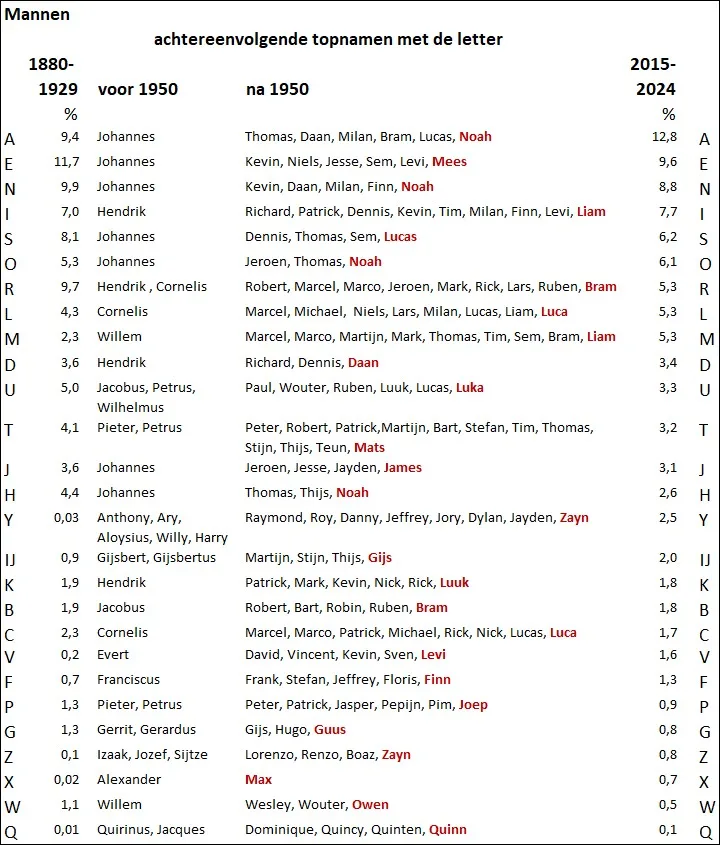 Percentage voorkomen van een letter in de eerste voornaam van alle mannen in de perioden 1880-1929 en 2015-2024, met achtereenvolgende topnamen met de letter voor en na 1950. De huidige topnaam in rood. Ordening naar huidig percentage.