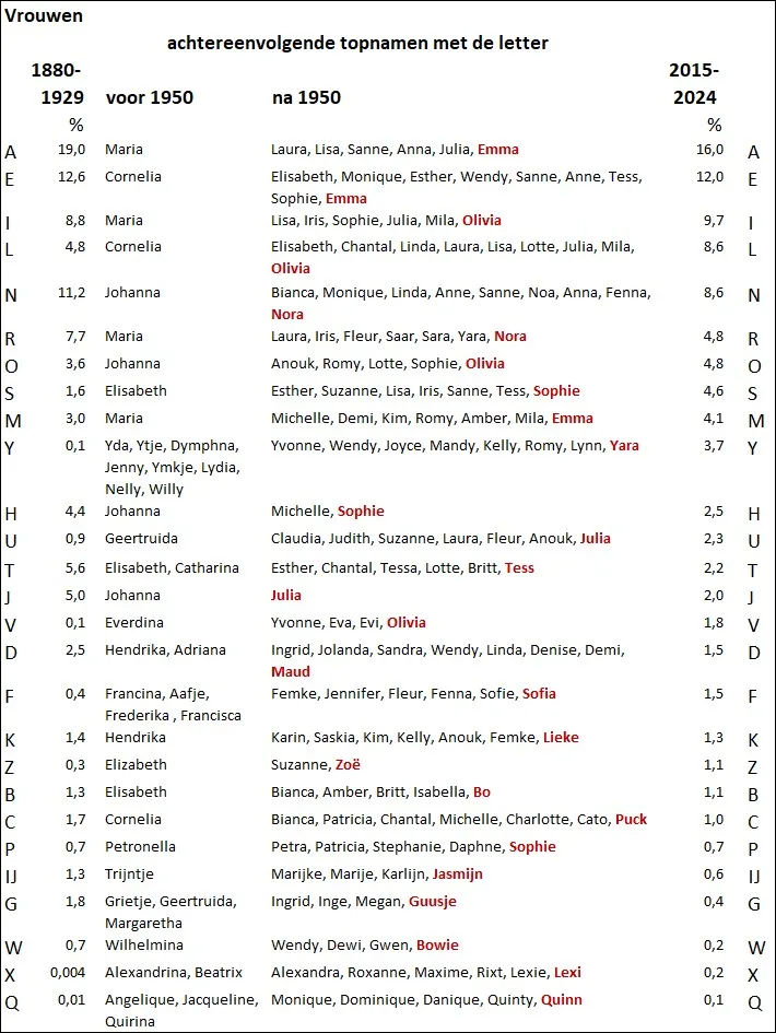 Percentage voorkomen van een letter in de eerste voornaam van alle vrouwen in de perioden 1880-1929 en 2015-2024, met achtereenvolgende topnamen met de letter voor en na 1950. De huidige topnaam in rood. Ordening naar huidig percentage.