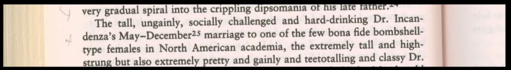The tall, ungainly, socially challenged and hard-drinking Dr. Incandenza’s May-December25 marriage to one of the few bona fide bombshell-type females in North American academia, the extremely tall and high-strung but also extremely pretty and gainly and teetotalling and classy Dr. Avril Mondragon …. etc.