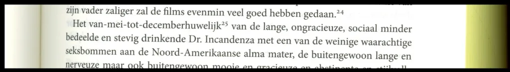 Het van-mei-tot-decemberhuwelijk25 van de lange, ongracieuze, sociaal minder bedeelde en stevig drinkende Dr. Incandenza met een van de weinige waarachtige seksbommen aan de Noord-Amerikaanse alma mater, de buitengewoon lange en nerveuze maar ook buitengewoon mooie en gracieuze en abstinente en stijlvolle Dr. Avril Mondragon …. etc.