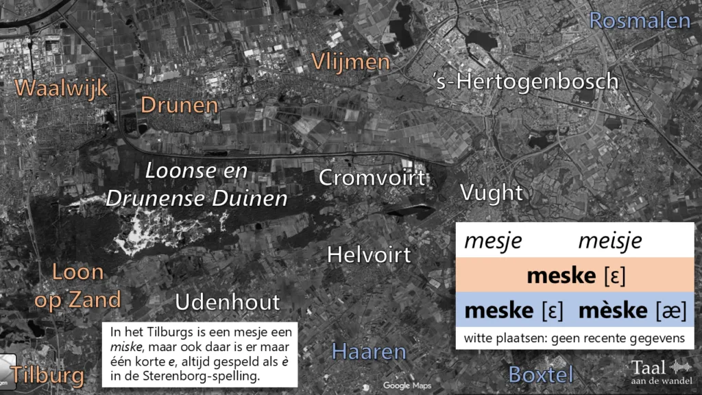 In Oost-Brabant zit dat anders. Ga je vanuit het oostelijkste Langstraatdorp Vlijmen 12 kilometer naar rechts op de kaart, dan kom je in Rosmalen. Daar is een mesje ook een meske, maar een meisje noemen ze een mèske. Dat accentje zet ik daar met een reden op. Het laat zien dat we hier met een andere klinker te maken hebben: niet de /ɛ/ van bed maar de /æ/ van het Engelse back – wat a-achtiger dus.
