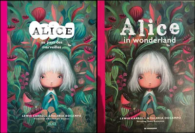 Het boek met de Docampo-prenten verscheen, denk ik (mijn navorsingen zijn nog niet afgerond) voor het eerst in het Frans, in 2020. De op de kaft genoemde vertaalster van de Alice-tekst, de Belgische Emmanuèle Sandron, vertaalt kinderboeken uit het Nederlands, Engels en Duits, en zal dit boek dan dus uit het Engels hebben vertaald.