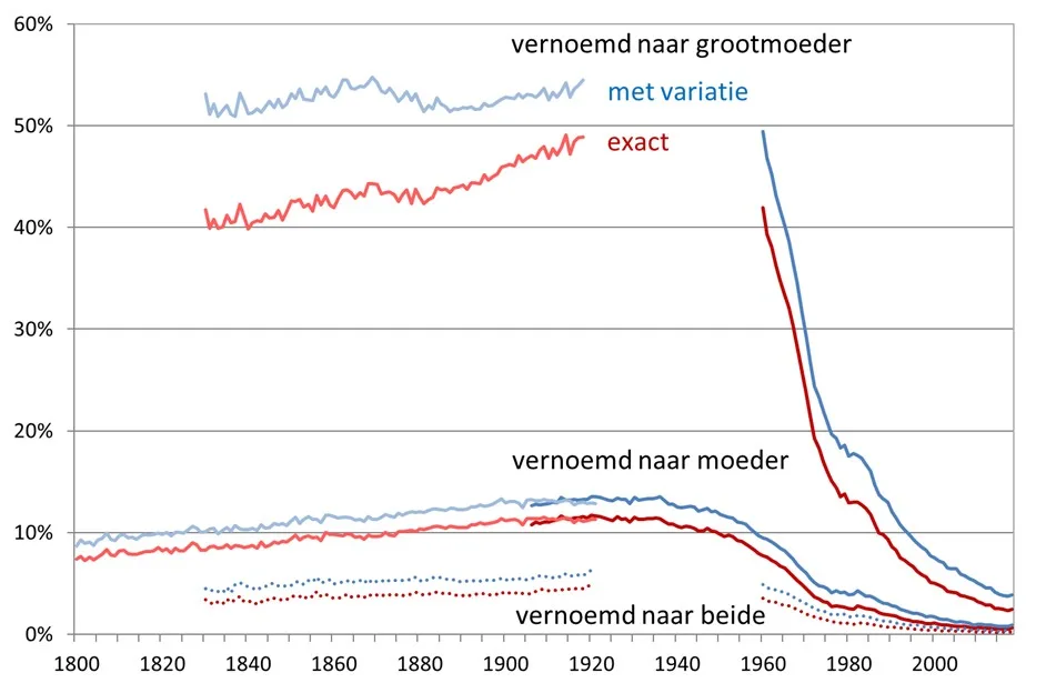 We onderzochten het percentage kinderen dat in Nederland in de eerste voornaam naar een grootouder of ouder werd vernoemd, wat voor ouders vanaf 1800 en voor grootouders vanaf 1830 mogelijk is. Hierbij onderscheiden we exacte vernoeming, waarbij het (klein)kind dezelfde eerste voornaam krijgt, en variabele vernoeming, waarbij alternatieve spellingen, schrijfwijzen en roepnamen ook als vernoeming worden gezien (zie figuur 1 voor jongens en figuur 2 voor meisjes). Voor 1920 werd van de jongens meer dan 47% exact naar een grootvader vernoemd, terwijl de vernoeming naar een grootmoeder voor de meisjes steeg van 40% tot 48%. Exacte vernoeming naar een ouder steeg tussen 1800 en 1940 van 10% tot 16% voor de jongens en van 8% tot 12% voor de meisjes. Daarnaast kan een kind zowel naar een ouder als grootouder met dezelfde naam zijn vernoemd. Dat is in de figuur gestippeld aangegeven. Dat geldt voor ca 40% van de vernoemingen naar een ouder, zowel voor jongens als voor meisjes.Samen betekent het dat voor 1950 ruim de helft van alle kinderen dezelfde voornaam kreeg als een ouder en/of grootouder.