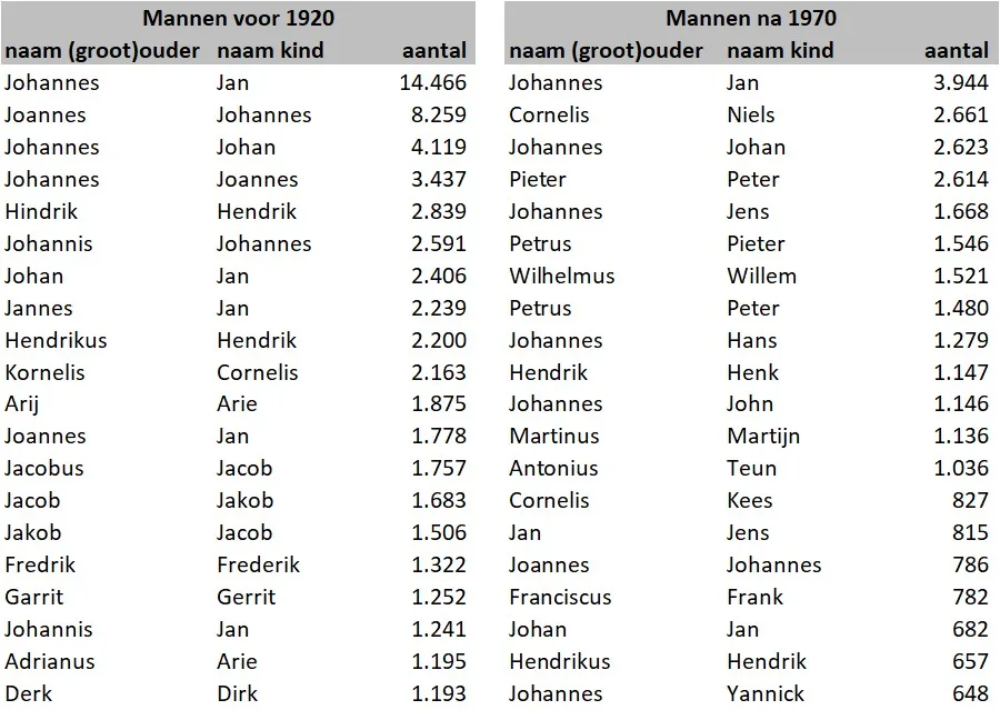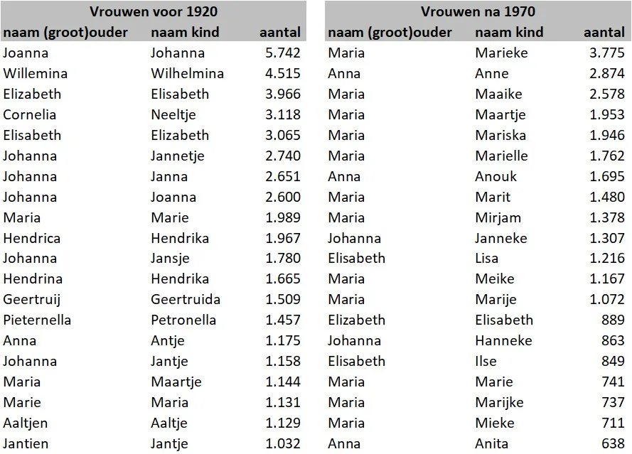 Wanneer is er sprake van vernoeming? We gaan er vanuit dat dat niet alleen het geval is bij dezelfde naam maar ook bij naamvarianten met dezelfde etymologische basis, waaronder roepnamen. Wat wel of niet naamvarianten zijn is niet altijd eenvoudig te bepalen, maar we accepteren variantparen als die in eerder onderzoek gevonden zijn (NAMES-project), of bekende roepnamen zijn (LINK) en controleerden dat nog eens handmatig. Hieronder geven we de top-20 van de meest frequente variantparen tussen (groot)ouders en kinderen voor gegevens die voor 1920 uit de huwelijksakten zijn afgeleid, en na 1970 uit de BRP. De laatste voorbeelden geven inzicht in de moderne vernoeming.