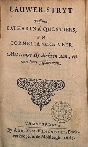 Cornelia van der Veer drukte haar stempel op het Amsterdamse literaire leven van de jaren zestig. In 1665 publiceerde zij samen met Catharina Questiers de Lauwer-stryt: een afzonderlijk uitgegeven dichtwisseling waarin de vrouwen elkaar uitdagen én loven. Ze zetten een wedstrijd in scène, claimen de lauwerkrans en laten het publiek meelezen, alsof ze elkaar de loef afsteken midden op het toneel. Dat dit de eerste door twee vrouwen gezamenlijk uitgegeven bundel was, maakt hun inzet alleen maar indrukwekkender: hier claimen twee vrouwelijke auteurs openlijk hun plek in de literatuur.