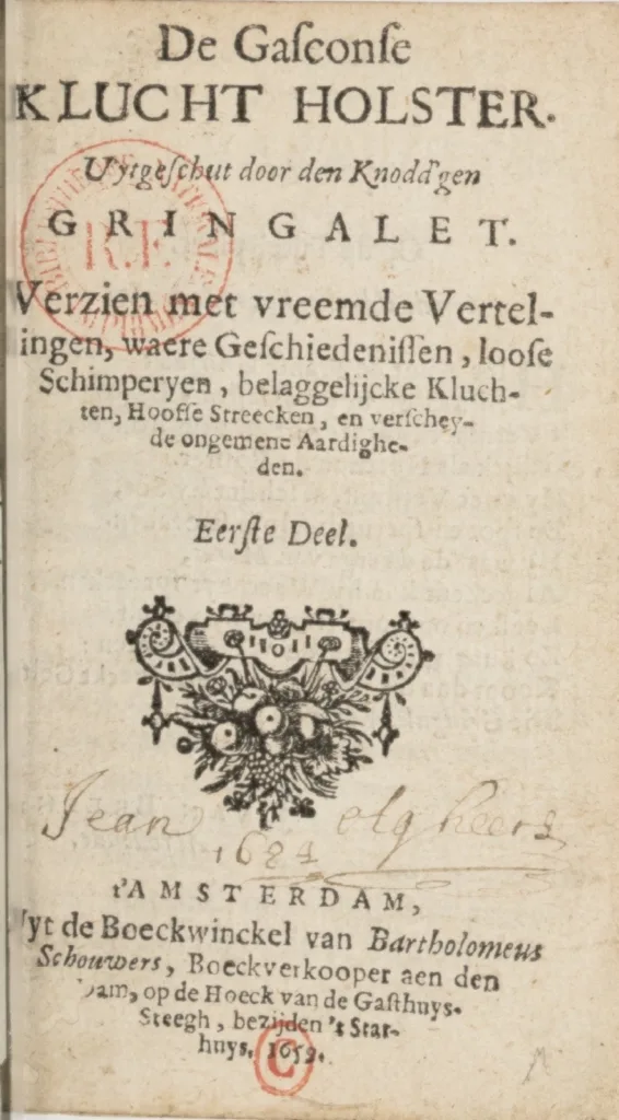 De Gasconse klucht holster. Uytgeschut door den knodd’gen Gringalet. 1659. Amsterdam. [digitaal raadpleegbaar https://gallica.bnf.fr/ark:/12148/bpt6k3216956#]