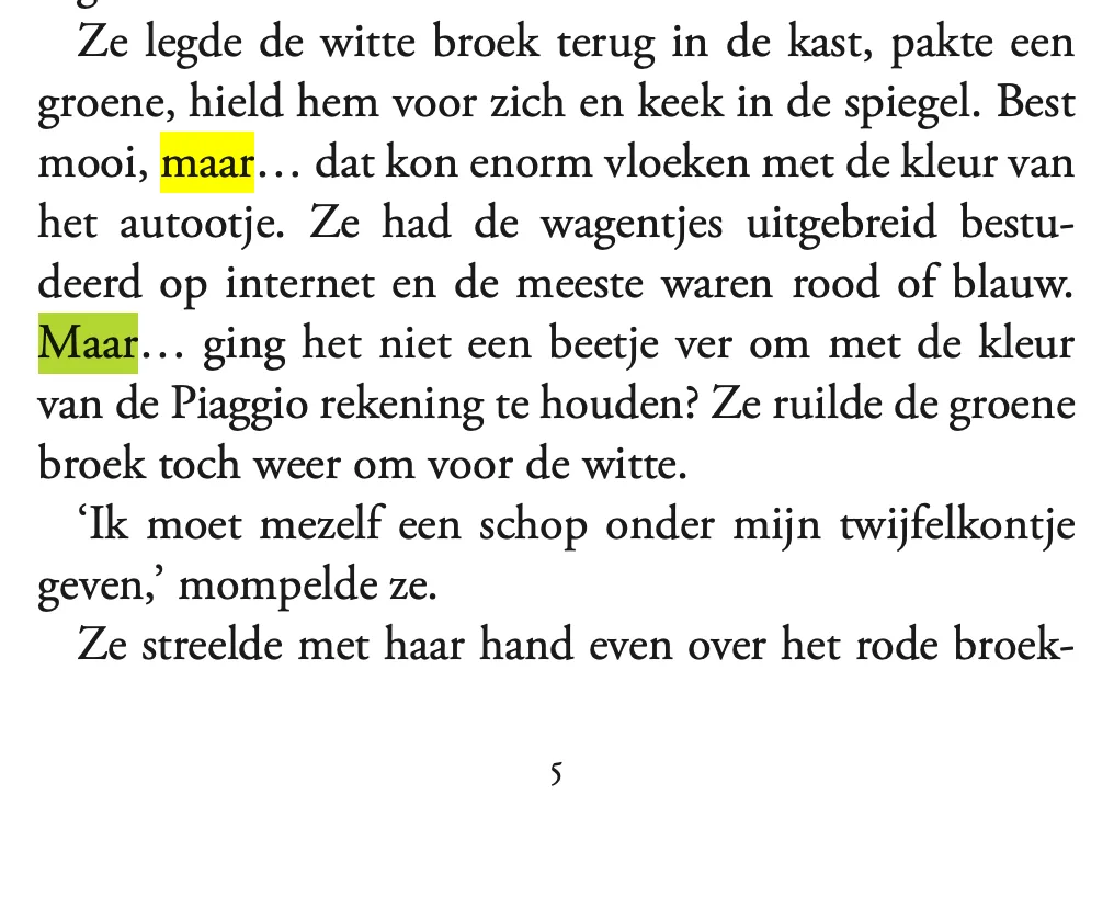 Het begint met een flash forward, een vooruitwijzing die vaak wordt toegepast in spannende boeken waarvan het echte begin niet zo spannend is. Wat meteen al opvalt zijn de spaties tussen de drie puntjes van het beletselteken en dat twee keer na het woord ‘maar . . .’ Waarom hebben ze dat laten staan? Over de spatie tussen het laatste woord en het beletselteken kun je van mening verschillen, maar in het Nederlands horen tussen die drie puntjes geen spaties.