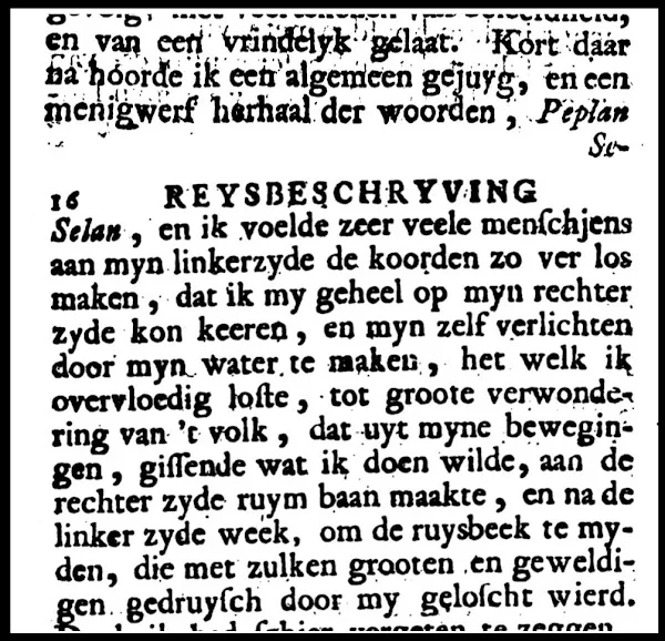 1727: Kort daar na hoorde ik een algemeen gejuyg, en een menigwerf herhaal der woorden, Peplan Selan, en ik voelde zeer veele menschjens aan myn linkerzyde de koorden zo ver los maken, dat ik my geheel op myn rechter zyde kon keeren, en myn zelf verlichten door myn water te maken, het welk ik overvloedig loste, tot groote verwondering van ’t volk, dat uyt myne bewegingen, gissende wat ik doen wilde, aan de rechter zyde ruim baan maakte, en na de linker zyde week, om de ruysbeek te myden, die met zulken grooten en geweldigen gedruysch door my geloscht wierd.