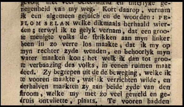 1792: Kort daarop, vernam ik een algemeen gejuich en de woorden: PEPLOM SELAN welke dikmaals herhaald wierden; terwyl ik te gelyk vernam, dat een groote menigte volks de strikken aan myn linker been in zo verre los maakte, dat ik my op myn rechter zyde wenden, en behoorlyk myn water maaken kon ; het welk ik dan tot groote verbaazing des volks, in eenen ruimen maat deed. Zy begrepen uit de beweging, welke ik te vooren maakte, wat ik verrichten wilde, en derhalven maekten zy aan beide zyde van den stroom, welke my met zo veel geweld en gedruis ontvliette, plaats.