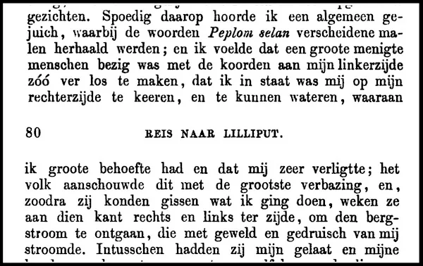 2026: Kort daarna hoorde ik alom roepen, met veelvuldige herhaling van de woorden Peplom Selan, en ik voelde hoe een menigte mensjes links van mij de touwen zodanig vierden dat ik me op mijn rechterzij kon draaien, om ter verlichting te wateren – wat ik zeer overvloedig deed, tot grote verbijstering van het volk, dat aan mijn bewegingen had geraden wat ik van plan was en aan die kant onmiddellijk links en rechts ruimte had gemaakt om de stortvloed die met groot geraas aan mij ontsnapte te ontwijken.