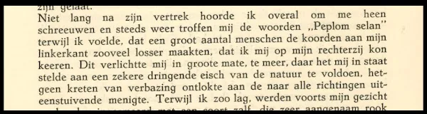 1940: Niet lang na zijn vertrek hoorde ik overal om me heen schreeuwen en steeds weer troffen mij de woorden “Peplom selan” terwijl ik voelde, dat een groot aantal menschen de koorden aan mijn linkerkant zooveel losser maakten, dat ik mij op mijn rechterzij kon keeren. Dit verlichtte mij in groote mate, te meer, daar het mij in staat stelde aan een zekere dringende eisch van de natuur te voldoen, hetgeen kreten van verbazing ontlokte aan de naar alle kanten uiteenstuivende menigte.
