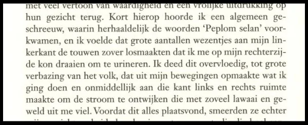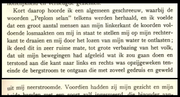 1974: Kort daarop hoorde ik een algemeen geschreeuw, waarbij de woorden “Peplom selan” telkens werden herhaald, en ik voelde dat een groot aantal mensen aan mijn linkerkant de koorden voldoende losmaakten om mij in staat te stellen mij op mijn rechterkant te draaien en mij door het lozen van mijn water te ontlasten; ik deed dat in zeer ruime mate, tot grote verbazing van het volk, dat uit mijn bewegingen had afgeleid wat ik zou gaan doen en terstond aan die kant naar links en rechts was opzijgeweken teneinde de bergstroom te ontgaan die met zoveel gedruis en geweld uit mij neerstroomde.