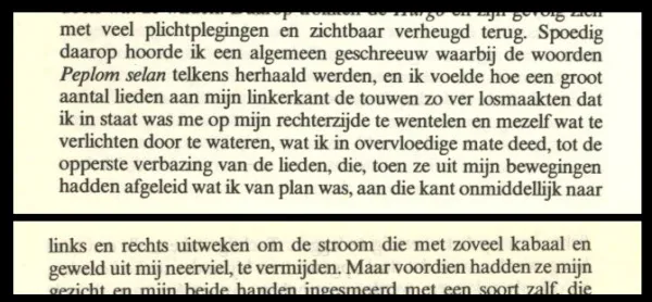 1979: Spoedig daarop hoorde ik een algemeen geschreeuw waarbij de woorden Peplom selan telkens herhaald werden, en ik voelde hoe een groot aantal lieden aan mijn linkerkant de touwen zo ver losmaakten dat ik staat was me op mijn rechterzijde te wentelen en mezelf wat te verlichten door te wateren, wat ik in overvloedige mate deed, tot de opperste verbazing van de lieden, die, toen ze uit mijn bewegingen hadden afgeleid wat ik van plan was, aan die kant onmiddellijk naar links en rechts uitweken om de stroom die met zoveel kabaal en geweld uit mij neerviel, te vermijden.